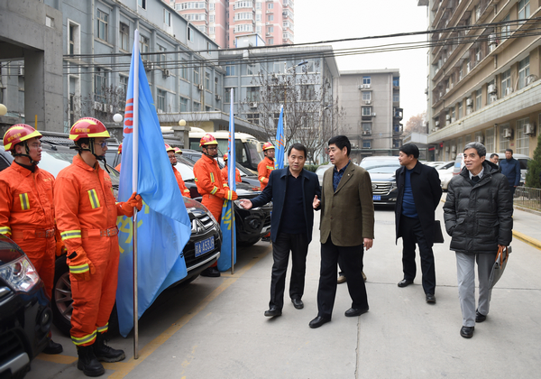 朱玉朝一行在座談前看望了救援隊隊員,查看了救援隊裝備設備。